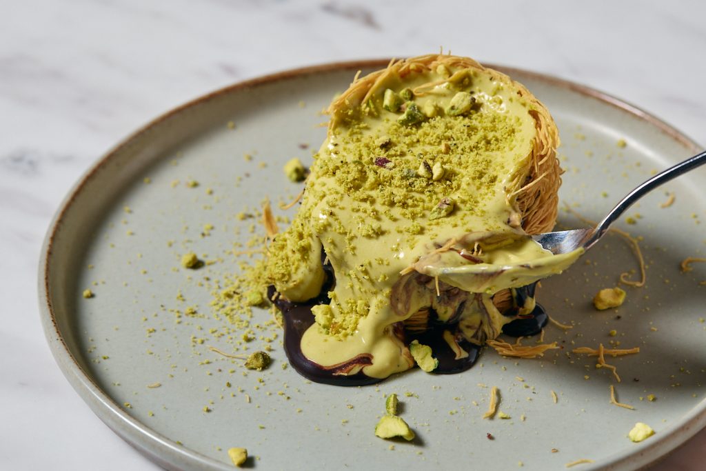 ピスタチオの濃厚な香りと、パリパリとしたカダイフの食感が洗練されたデザートへと昇華させました。話題の味わいを表参道のゆったりとした空間で、プロのクオリティにてお楽しみいただけます。