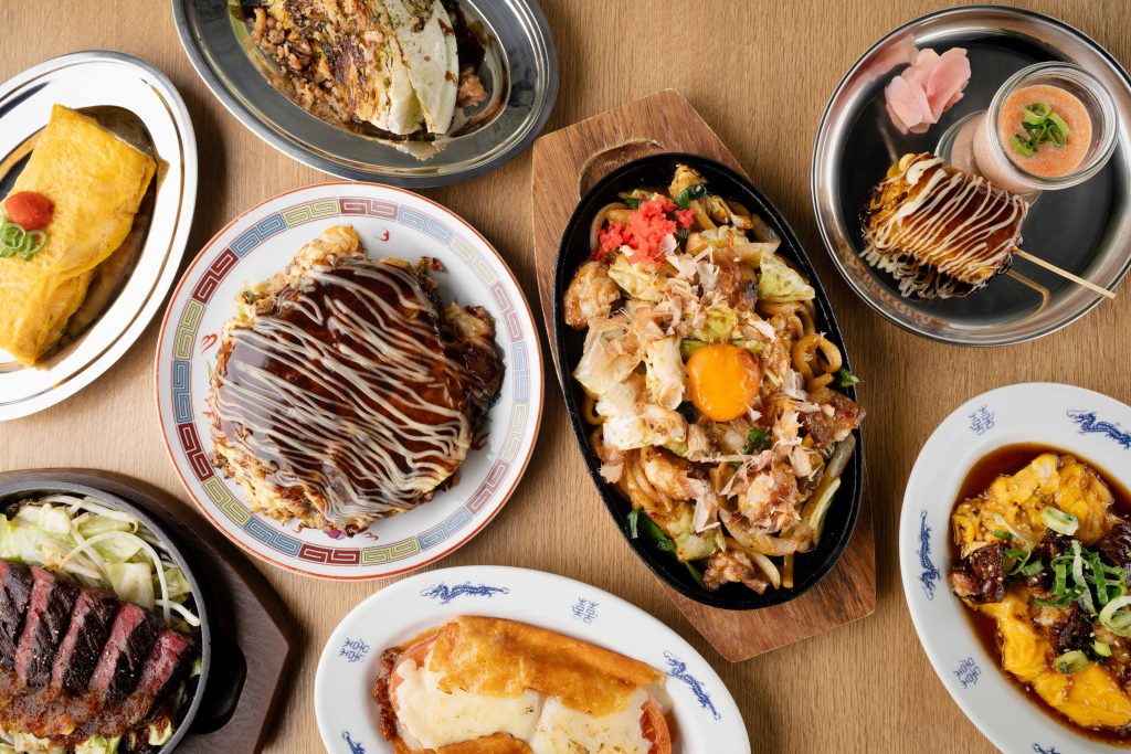 本店さながらの”たまちゃん流”「ごちゃまぜ美学」。本格お好み焼きをはじめ、「名物ホルモン焼き」といった鉄板料理、また二〇加屋長介とのハイブリットメニュー「雲仙ハムのガーリックチャーハン」「モツ入り焼きうどん」など、まさに「ごちゃまぜ美学」を体現したメニューラインナップに。