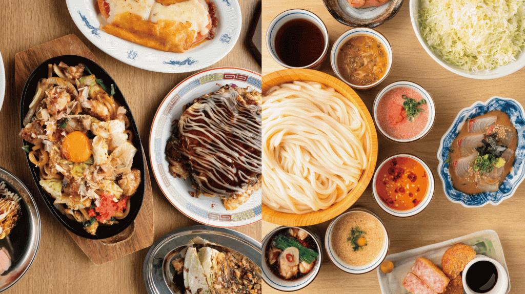 ふっくら香ばしいお好み焼きや焼きそば、しっかり出汁を効かせた自慢のうどんをはじめ、雲仙ハムカツ、旬のお刺身など食事にもお酒にも寄り添うメニューを揃えました。また、ランチタイムには気軽に楽しめるうどん各種をご用意。